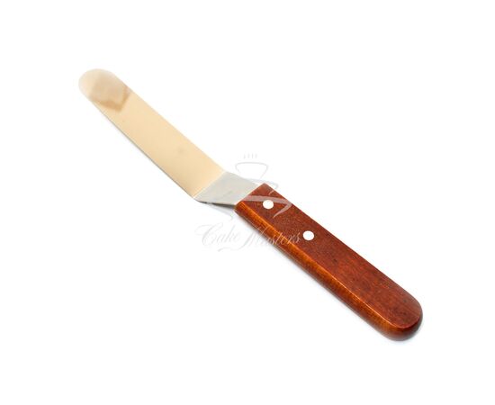 Металлическая изогнутая лопатка с деревянной ручкой. Длина рабочей (прямой) области 10 см.