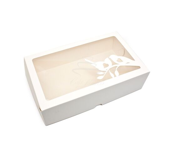 Коробка универсальная для укондитерских изделий с прозначным окном и силуэтами птиц с сердечками.