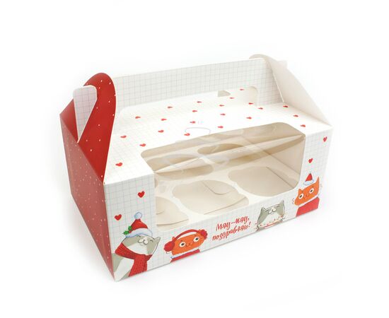 Картонная коробка с ручкой и окном для 6 капкейков, кексов, маффинов. Изображение на новогоднюю тему с надписью "Мяу-мяу, поздравляю!". Вставка на 6 капкейков в комплекте.