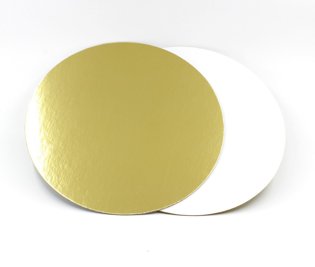 Картонная влаго-жиростойкая подложка для тортов и десертов. Изготовлена из картона с покрытием с двух сторон. С одной стороны - золотистая пленка, с другой - жемчужно-белая. Толщина подложки - 1,5 мм (средняя). Диаметр подложки 20 см.